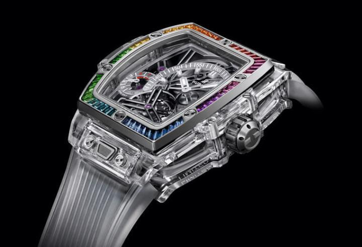 另款蓝宝石表壳版本则是将透明结合彩虹的概念,宇舶先以四块蓝宝石制成手表的上层结构(含表圈)、末端两个上盖、表背下层结构,且由于Spirit of Big Bang系列是比较少见的酒桶型表壳,所以它的制作过程需启用特殊工具以及有别于圆形表壳的制程才能完成。而除了表壳不易制作外,宇舶也还在表圈上的金材质部分镶上54颗梯形切割多彩宝石,使得通透感十足的手表因为融入彩虹圈而更富有欣赏价值。表款搭载的HUB6020为品牌专为酒桶型打造的作品,它的陀飞轮装置设在6点方向,至于时、分显示则是偏心于接近面盘右侧,另外8点方向还有动力储存显示可以了解手表5日动力的消长情况,加上镂空处理尽展透明表壳之美,放眼表坛很少能找到相似设计的复杂机芯,从中突显了宇舶的创意与工艺水准。