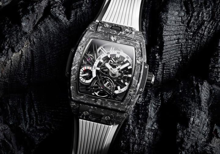 白色碳纤维材质/HUB6020手动上链机芯/偏心时、偏心分显示/陀飞轮装置/动力储存显示/蓝宝石水晶镜面、透明底盖/防水30米/表径42mm/限量100只/参考价:680,000 RMB