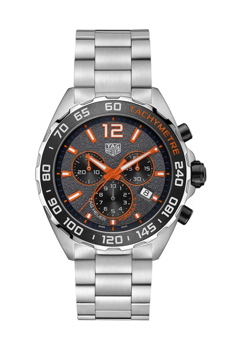 2021年泰格豪雅全新的F1系列设计灵感来自1980年代流行的活力橙和柠檬黄两种颜色,品牌一口气推出四款作品,包括三只计时码表以及一只大三针手表,它们都是石英机芯,代表入手门槛相对也更亲切些。除了机芯之外,这批新生代的F1赛车表还有一些共同特征,包括采用不锈钢打造43mm的表壳,甚至它们也都有石英表比较少间的陶瓷圈配备,再来泰格豪雅也采用带有沥青效果的面盘串连起新款。