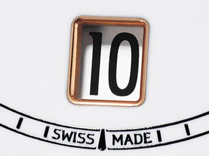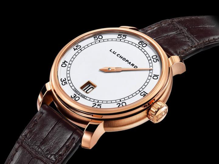 表款面盘上只设有一枚玫瑰金指针,搭配面盘外围的60分钟刻度用来指示分钟资讯,至于小时则是从6点方向的视窗显示,萧邦同样采用玫瑰金制作日期窗外框,里面的日期转盘延续面盘整体的基调呈现出白底黑字的样貌,每到整点,小时转盘就会跳转到下个数字,阅读起来既清楚又直觉。品牌之所以会将小时窗设在6点方向有其用意,因为整点时分点肯定是位在12点方向,这时候面盘6点位置等于“净空”,因此佩戴者整点时阅读小时的瞬跳动作完全不会被遮挡,让人可以看得尽兴。