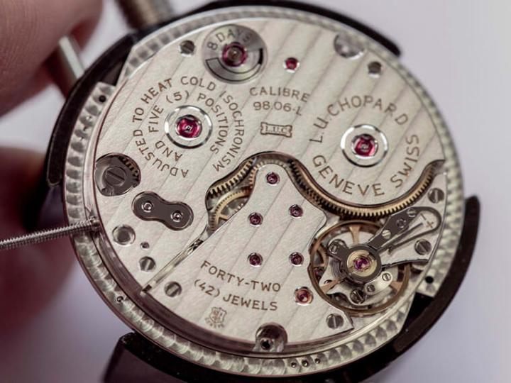 翻到表背映入眼帘的是透明底盖以及下方的L.U.C 98.06-L手上链机芯,这枚机芯机板可见大片的日内瓦波纹修饰,左下角则有日内瓦印记证明它的作工水准与走时品质,同时机芯背面12点方向还设有一个小巧的动力储存显示,佩戴者可以从中阅读8小时动力的消长情况。另外细看机芯的擒纵系统还会发现Phillips曲线双层游丝以及鹅颈式微调等设计,展露高级机芯应有的讲究规格,对于体现手表的高精准度也有正相关。