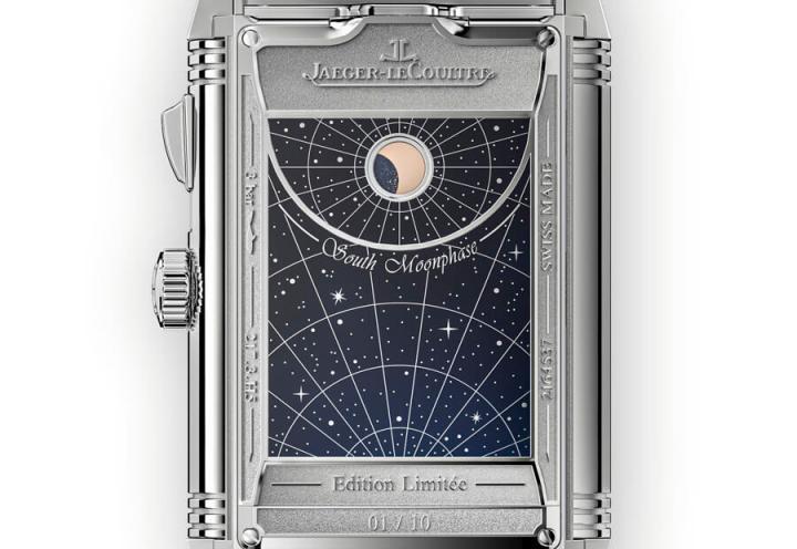 至于Reverso手表通常表壳背面(第四面)通常就是作为保护之用,顶多加上一些刻字或图案增加视觉美感,但在这款表上却别开生面再放上与第三面有呼应关系的南半球月相,其以蓝色渐变漆面示人,上面绘有经纬线以及星空图案,仅在接近12点方向的地方设置较为传统的圆形月相窗。手表的月相功能通常都是以北半球为主,因此可以在一款表上同时观察到南、北半球月相的设计相对比较稀有。