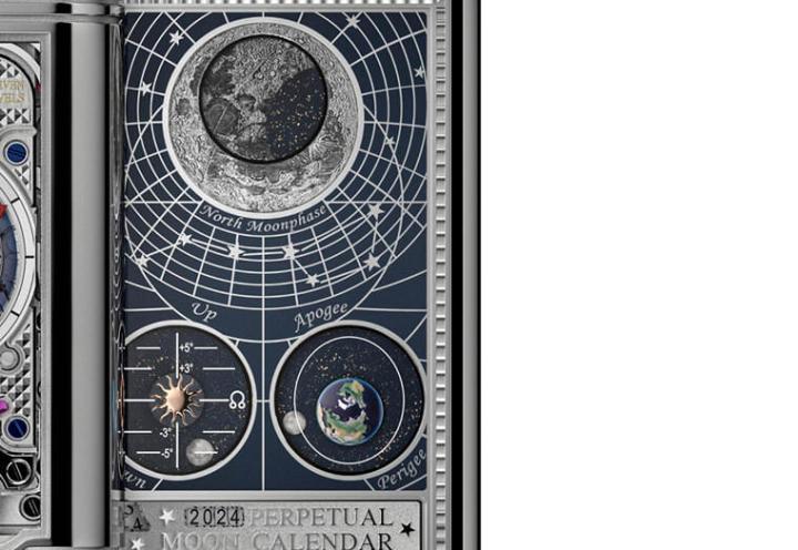 原本表壳内部用来加上一些打磨装饰的内面(第三面)如今也融入了和天文相关的复杂功能。第三面的上半部为周遭饰有经纬度的北半球夜空,此处中心是一枚经由雷射雕刻的月亮图案,月亮图案中央含有一枚蓝色漆面圆盘,它会依照月龄的变化覆盖雷射月亮图案,展现出月亮的会合周期(也就是我们一般所说的月相显示),表款的月相显示精准度特别高,每1111年才会出现一日误差,意味下一次需要调整月相的时间已经是好几代以后的事了。