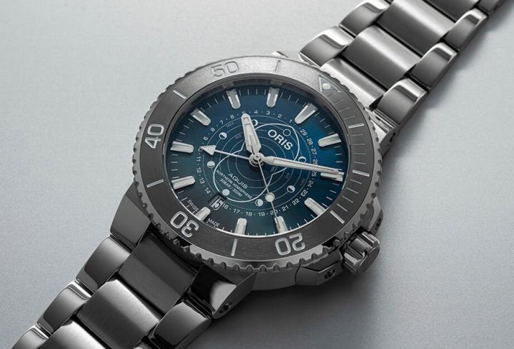 前述规格与一般Aquis潜水表没有太大的变化,但是手表的面盘设计就完全是另一番天地了。Dat Watt限量手表融入ORIS因应专业潜水人员需求所量身打造的功能:月相以及(北半球)潮汐显示,在抢眼的蓝灰色渐层面盘上可见中央设有以29.5日为周期的月龄刻度,同时月龄刻度附近也衍生出月相周期以及相对应的潮汐资讯,只要佩戴者有将日期调正确,那么面盘中央第四根指针就可以清楚指示相应的月相与潮汐周期。