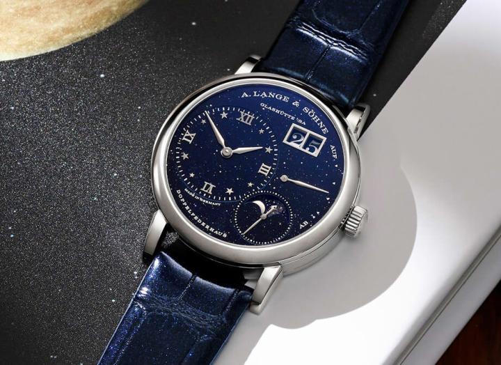 新款Little Lange 1 Moon Phase采用18K白金表壳,搭配蕴含闪亮物料的亮面深蓝色皮革表带搭配,表带同时配备白金表扣,而这次除了白金表壳款式外,朗格另外也推出白金表壳表圈镶钻款,塑造出更为华丽的视觉印象。