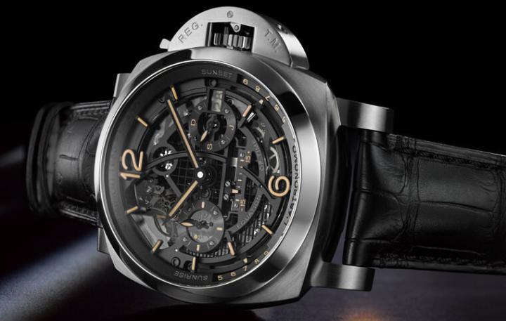 PAM00920的表壳有50mm那么大,不过因为沛纳海是用钛金属材质制作,因此佩戴在手上的负担感也会降低一些。表款的面盘采用开面设计,看起来比多数沛纳海手表要复杂许多,而在面盘上可以看到的资讯除了小时、分钟和小秒外,还有日期显示、6点钟方向的线型时间等式显示(真太阳时与平均太阳时的时差)、第二地时间以及分别置于面盘左下角与右下角的日出和日落时间。同时在面盘10~11点方向则还有沛纳海独树一帜的垂直轴心30秒陀飞轮,它和传统陀飞轮相当不同的自转周期以及旋转方向,在在让手表富有强烈的视觉魅力。
