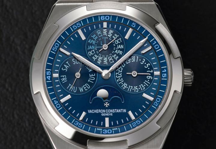 蓝面算是Overseas系列的定番色,江诗丹顿新款Overseas超薄万年历以蓝色漆面制作面盘,并施加太阳放射纹处理,搭配金质刻面的夜光时标及指针,除了平常阅读时间一目了然之外,在暗处也有夜光效果不怕想看时间手上却又一片漆黑。