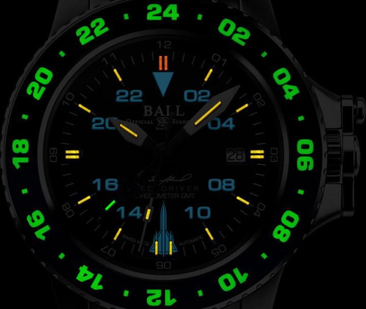 Engineer Hydrocarbon AeroGMT Sled Driver表壳为不锈钢材质,表径42mm是运动表中的适中尺寸,波尔表采用自家研发的技术将蓝宝石水晶玻璃打造成表圈,提供手表外观坚实的保护性;此外品牌也从Brian Shul驾驶的SR-71黑鸟隐形侦察机获得灵感,针对在驾舱内的黑暗环境,强化手表的夜视效果,手表在蓝宝石水晶表圈下方、面盘外围的时标以及指针上都镶有BALL WATCH招牌的微型气灯,另外面盘内圈的24小时刻度也图有SuperLumiNova夜光物料。值得一提的是,波尔表针对手表不同的显时系统采用了不同颜色的夜光效果,例如戴表第三地时间的蓝宝石水晶表圈下方的气灯夜光效果为绿色、代表所在地时间的时标则会发出黄色与橙色夜光,另外象征第二地时间的面盘内圈24小时刻度又是发出蓝色夜光,因此在黑暗环境,手表同时会用3种主要夜光颜色辅助佩戴者辨时,相当一目了然。