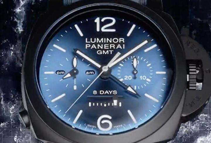 PAM01135采用蓝色太阳放射纹面盘,这与过往搭载同一枚机芯的作品稍有不同,展现出新意,至于手表的指针也为了呼应表壳而涂上黑色,包括三明治面盘结构以及指针等处都覆上白色Super-LumiNovaTM夜光涂层,展现品牌素负盛名的高强夜视效果。至于面盘格局方面则和历年搭载此枚机芯的作品相同,包括9点方向的小秒盘与日夜显示、3点方向的计分盘,再来就是6点方向也是沛纳海特色的现行动力储存显示,从动储显示上方的”8 DAYS”字样,可见其超过一周的长动能。另外面盘中轴还有第4根指针,作用不需多说当然就是显示两地时间囉。