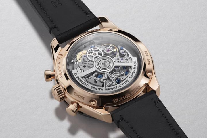 18K玫瑰金材质/El Primero 3600自动上链机芯/时、分、小秒、日期显示/计时码表功能/蓝宝石水晶镜面、透明底盖/防水100米/表径41mm/参考价:150,000RMB