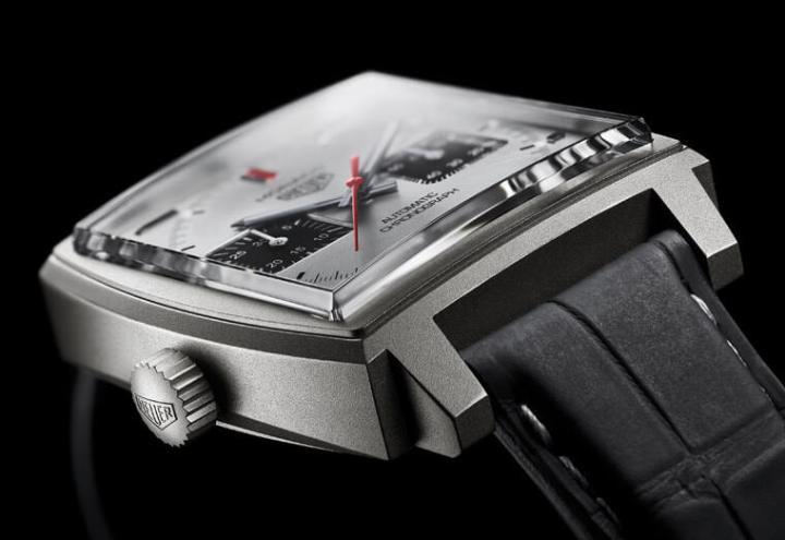 虽然机芯和手表外观设计都是沿袭1969年的古董Monaco而来,但泰格豪雅这次别出心裁采用钛金属材质制作手表表壳,这还是系列诞生以来首度出现的新尝试。品牌在钛金属表壳外表加上喷砂处理形成雾面效果,形成不易留下指纹的迷人视觉层次。另外手表的复古况味还表现在表冠与计时按把的配置上,这款钛金属Monaco的表冠设置在左侧、两枚计时按把则是设置在右侧,这种设计是1969年Monaco计时码表初次诞生时就具备的元素,以今日眼光看来还是显得非常特别。