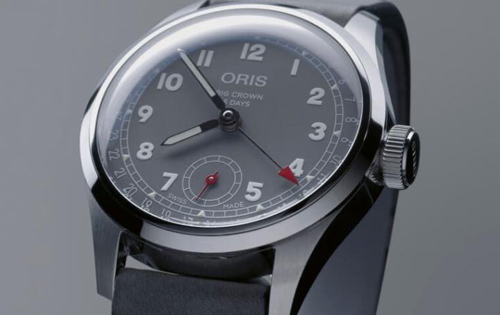 至于面盘的灰色调看起来虽然不是太抢眼,但它其实是为了呼应品牌20世纪前半的作品特色,另外包含面盘采用的阿拉伯数字时标也和现代的Big Crown系列有点不一样,因为它的设计也是来自ORIS的古董手表。不过Hölstein 2021采用指针式日期这点倒是和目前Big Crown系列的部分款式有异曲同工之感,但是它采用小秒显示——小秒盘又置于6点方向这点又很跳脱系列的框架,细节中展现Hölstein 2021身为限量版又具备庆祝品牌周年纪念的特别意义。
