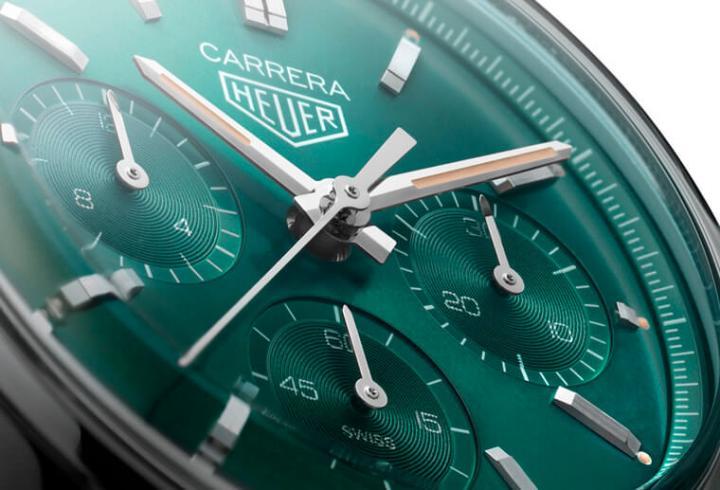 新款Carrera绿面限量自动计时码表和品牌早期制作的HEUER Carrera 2447拥有一脉相承的元素,包括修长的表耳线条、圆滑表壳、圆柱形计时按把以及面盘上的设计等等,不过Carrera 2447当年的表径为36mm,以现代角度而言有点偏小,因此Carrera绿面限量自动计时码表的表径已经提升到39mm,戴起来显得大小适中。