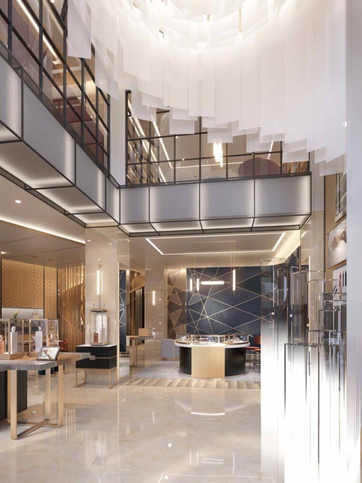 如果走进店面,迎面而来会看到一个两层高的宽阔中庭,自然采光从上流泄而下,再往内部走会注意到一面以麦秆镶嵌工艺组成的蓝色马耳他十字图案,这时望向左边会出现一个开放设计的陈列柜,里面摆的当然就是品牌各式精工细作的钟表作品。