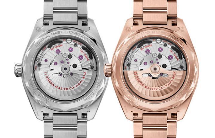 由于表壳尺寸不同,所以Aqua Terra小三针分别搭载8802自动机芯(38mm款)和8916自动机芯(41mm款),两款机芯都属于欧米茄目前主流的同轴擒纵大师天文台认证机芯,也就是说它们的抗磁能力都比一般机芯更优,并且在整体品质方面有高于COSC瑞士天文台认证的表现。两种尺寸的贵金属版本会换上8803机芯(38mm款)和8917机芯(41mm款),主要差别在于这两款机芯的自动盘和摆轮桥板会改以Sedna™金材质制作,以更华丽的风格呼应表壳的尊贵价值。