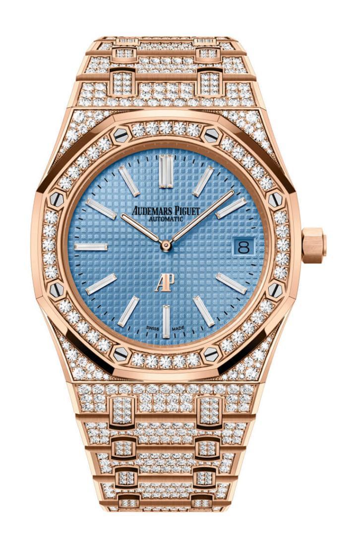 三只表的日期盘会随着面盘颜色做出调整,例如天蓝色面盘的日期盘就会是天蓝色背景烘托黑字、黑色面盘则是黑底映衬白字,不仅让面盘看起来更有一体感,同时也不会影响到佩戴者阅读的直觉性。此外爱彼还在11个方位的时标镶上矩形钻石(3点方向因为设有日期盘而取消时标),这样一来面盘兼顾了高雅风格又能延续系列的设计特征,不失为两全其美的解决办法。