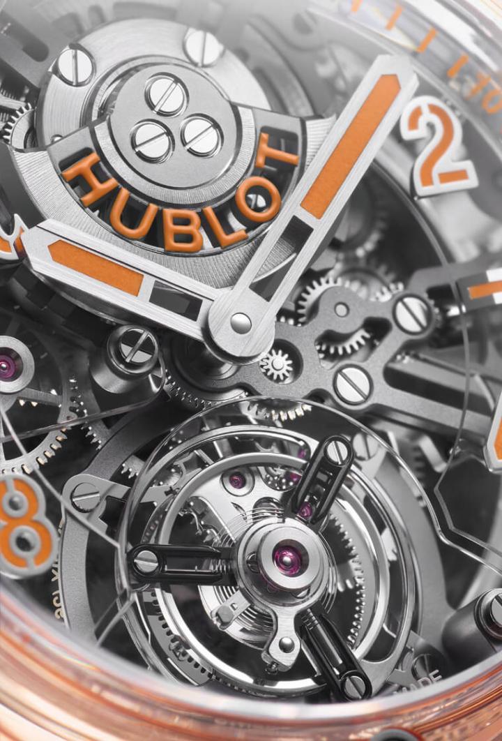 宇舶之所以能打造出橘色蓝宝石表圈,因为他们在蓝宝石加工过程加入钛元素与铬元素,使得过往都是无色的透明表壳也能展现出缤纷的色彩活力,让蓝宝石这种坚硬耐刮的少见表壳材质,得以衍生出比起无色更强大的吸睛功效。而在透明表壳和橘色透明表圈的穿透视野中,Big Bang Only Watch陀飞轮的复杂机芯结构得以无死角地全面尽收眼底,让人看得赏心悦目。