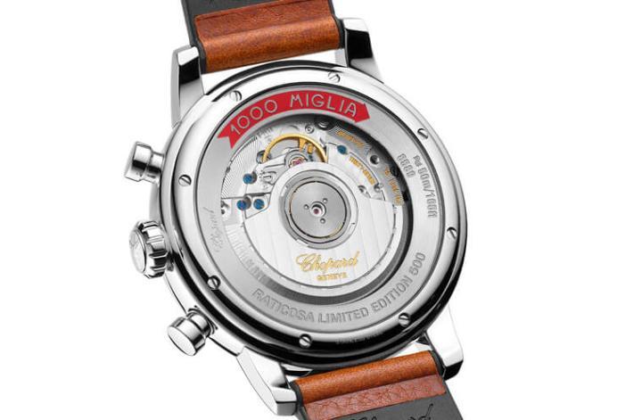 在手表背面,可见透明底盖边缘由螺丝固定并点缀上红色的1000 Miglia标志,以及镌刻\"Raticosa\"字样,这些元素不仅再次强调萧邦与Mille Miglia车赛间深厚的渊源,也从中延续Raticosa赛道备受车迷推崇的历史名声。