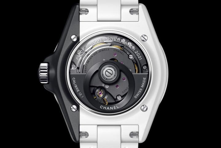 J12 Paradoxe Only Watch同样搭载12.1机芯,不过品牌特别将机芯零件镀黑,并在透明底盖上缘印上”PIECE UNIQUE”和”ONLY WATCH 2021”等于拍卖会相关的字样,展现专为拍卖慈善目的而生的稀有收藏价值。