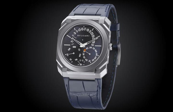 钽金属本来就有加工不易的先天难关,偏偏它遇到的又是Octo Finissimo这种造型繁复、切角超多但又要保持超薄空间的作品,改成钽金属表壳的Octo Finissimo Perpetual Calendar在整体厚度上并未有丝毫让步,依旧呈现出5.8mm的破纪录超薄水准,而宝格丽这次替手表配置的深蓝色漆面个中也有品牌自己的考量,原来深蓝色是为了呼应钽金属特有的蓝灰光泽,这点从鳄鱼皮表带的颜色也可见一斑,可见宝格丽对手表整体的形象和配色都有通盘考量。