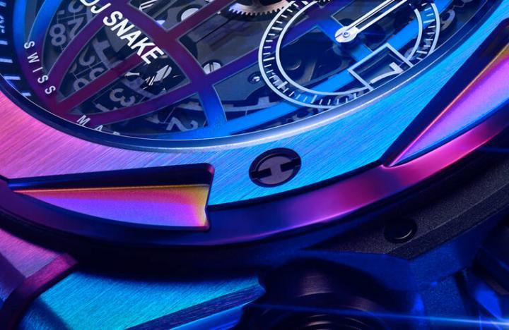 首先最明显的变化在于表壳整体视感,宇舶采用钛金属制作这款大爆炸计时码表不是什么开创新的用料,但特别就特别在品牌交互利用蒸镀和溅镀等技术在表壳表面形成多层膜复合结构,类似的效果让人想起G-SHOCK的彩虹IP离子电镀,但是高级制表界里面过去很少这种设计,因此宇舶这次也算是又完成了一项创新之举。大爆炸蛇爷计时码表的外观看起来一言难尽,它带有蓝色、紫色、黄色等不规则的色彩变化层次,看起来就好像置身在电音派对里面那种迷幻炫目的氛围里。