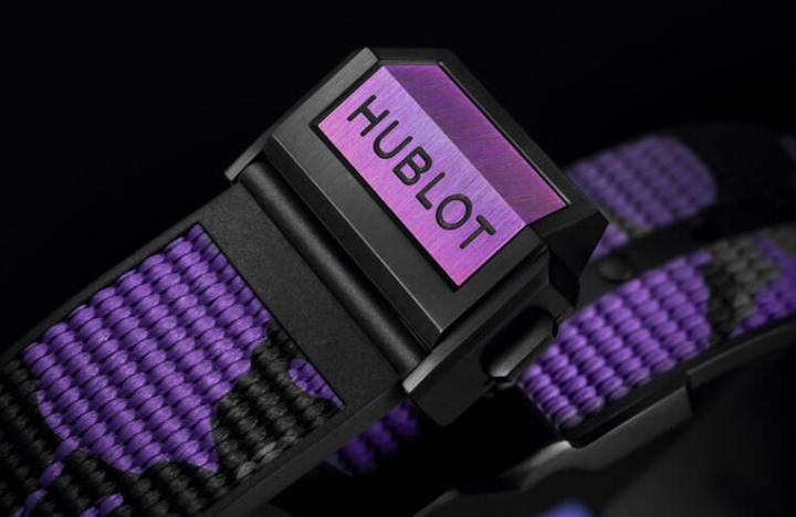 从大爆炸蛇爷计时码表上下表耳的按钮可以发现它具有One Click表带快拆装置,宇舶此次共提供两款表带给表主,一条是饰以灰色、黑色和紫色迷彩图案的橡胶表带,另一条也是橡胶表带,不过它只有单色、也就是品牌标准的黑色带立体刻纹设计,无论佩戴者想要比较花俏的感觉或是朴素的风格都可以自行替换表带,同时表扣搭配的金属也同样加上彩虹视觉效果,在细节上与表壳表现高度一致性。