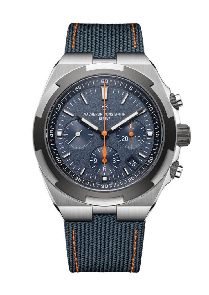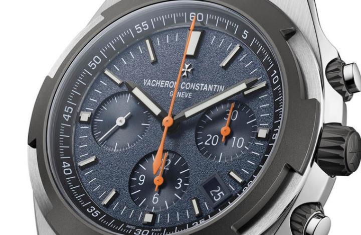 两款Overseas “Everest”限量表的灰蓝色面盘都经过粒纹装饰,并搭配江诗丹顿精心配置的局部亮橘色指针细节(如两地时间款的GMT指针、日夜显示指针以及计时码表款的中央计时指针以及计时针与计分针),明暗对比的色彩搭配突显出手表功能性的丰富。