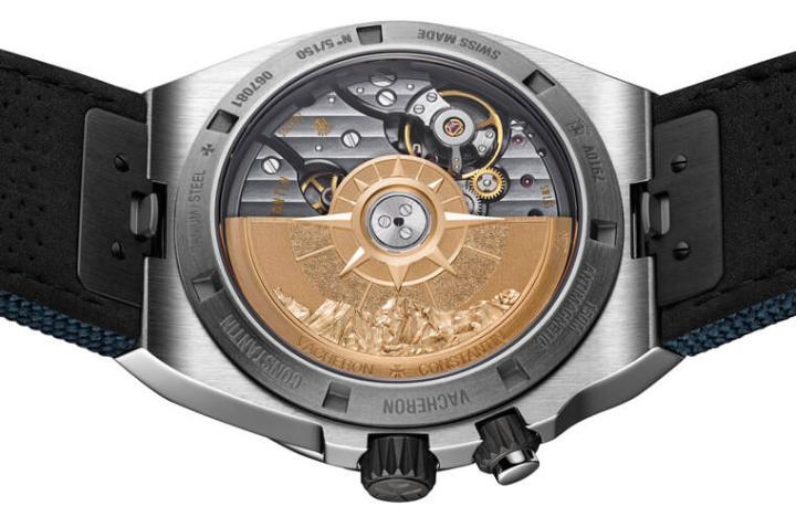 因为限量特殊版的身份,因此翻到表背还会有一个小小惊喜。借由透明底盖可以分别看到两款表搭载的5110 DT/2机芯(两地时间款)和5200/2机芯(计时码表款),它们与系列其他同功能款式有个细微差别在于22K粉红金自动盘上精心雕刻源自Cory Richards某次攀登喜马拉雅山脉所拍摄圣母峰的照片,具体而微将手表的冒险精神浓缩在自动盘装饰上,让人看了不禁发出会心一笑,此外江诗丹顿还额外以NAC电镀赋予机芯底板一层深灰色调,这跟好与钛金属表壳的设计呼应,也间接展示手表限量版的身份,蕴含在表款中的各种特殊细节让人爱不释手。