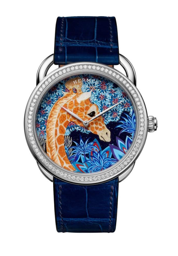 The Three Graces丝巾为Alice Shirley 2020年创作的丝巾图案,图案最初的灵感来自艺术家过往的一趟南非之旅,当时她无意间发现三头被金合欢树部分遮蔽的长颈鹿,因此原本的方巾图案包括三只长颈鹿与围绕在牠们四周的金合欢树。不过由于Arceau手表也就38mm大,要完全把The Three Graces丝巾图案放进手表面盘会有一点勉强,而且可能无法做到面面俱到,因此爱马仕当机立断决断聚焦在其中一头长颈鹿就好,这让面盘可以看得更清楚动物主题与周围的植物背景。