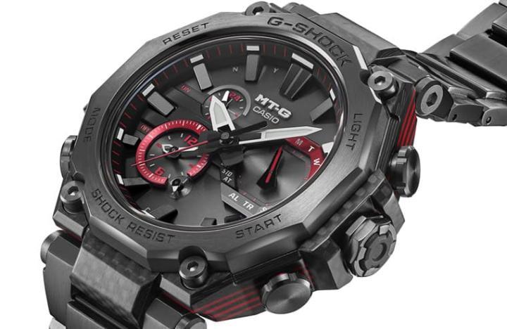 CASIO G-SHOCK继2020年发表具有双层防护结构的MTG-B2000系列后,2021年再推出两款接班作MTG-B2000YBD和MTG-B2000XD,表款导入了碳纤维元素,在保有腕表内外的设计特征之余,借由异材质组合,赋予腕表视觉新意与更臻优化的佩戴舒适度。 MTG-B2000YBD比起先前采用不锈钢材质的MTG-B2000相比,重量减轻竟高达77%,这是因为表款外壳共由235层碳与玻璃纤维片交织而成,一方面能达到减重目的,同时也还能维持腕表外观的硬度与保护效果;MTG-B2000YBD的玻璃纤维层选用能象征G-SHOCK制表热情、也是品牌人气保证的红色,因此表壳侧面可见碳材质与玻璃纤维层叠形成的黑红配色,第一眼便显得相当醒目,同时黑红配色也能与腕表正面的黑色表壳、面盘与红色表眼等细节呼应,散发活力奔放的鲜明个性。
