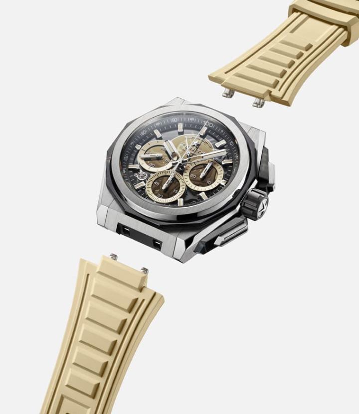表款拥有表带快拆装置,它有点像是他牌的Overseas手表般,因为真力时除了原厂搭配的钛金属链带外,还同时附上一条米色橡胶表带与黑色Velcro®魔鬼毡表带,让佩戴者可以随时依照喜好变换手表风格。
