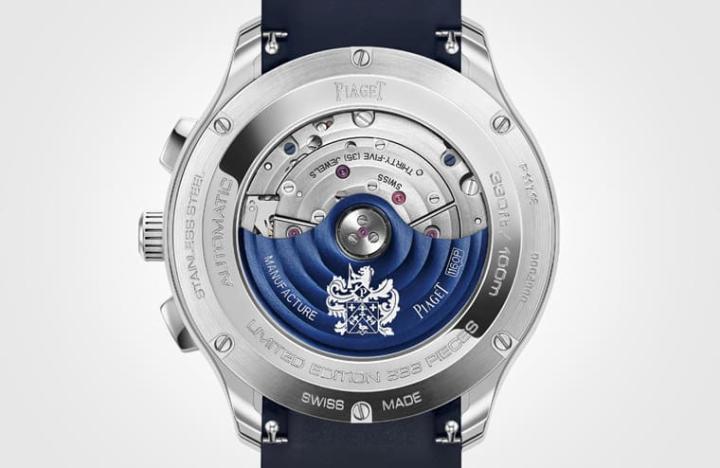 Polo计时码表搭载伯爵当初为了系列改款新开发的1160P机芯,与品牌同性质的880P机芯相较,1160P的25.58mm直径较小、零件262枚也较少,但是机芯厚度5.72mm反而比880P略厚一些,其他重点规格两者相去不远,例如同样有50小时动力储存、震频28,800vph,计时组件也都采用垂直离合与导柱轮的组合,以计时机芯来说,1160P的厚度算是相对纤薄,不过表壳的整体厚度有11.2mm就跟伯爵其他超薄表有明显区隔了。之所以不特别将表壳做薄或许跟系列的休闲运动风格定位有关,Polo计时码表和三针款的防水性能都达到100米,不过伯爵在表背的设定上反而没有太坚持纯运动个性而采用透明底盖,这让手表既能维持运动机能性,也满足表主想观赏机芯细节的愿望。新款Polo计时码表虽然机芯不变,不过品牌特别把自动盘镀成了蓝色用来呼应蓝白熊猫面的特征,比起旧款深灰色的自动盘,镀成蓝色的视觉效果当然更迷人。