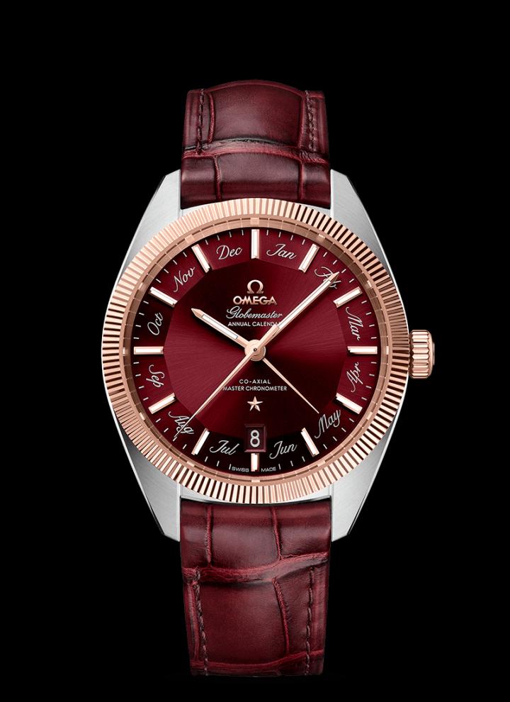 第二款腕表配备不锈钢表壳以及欧米茄独家玫瑰金合金18K Sedna™金抛光表圈。这种合金还被用于表冠,以及太阳纹磨砂表盘的细节,包括立体斜削指针、欧米茄标志、时标与星座星星标志。酒红色皮革表带以及欧米茄8922同轴擒纵大师天文台年历机芯为腕表设计划下完美句点。