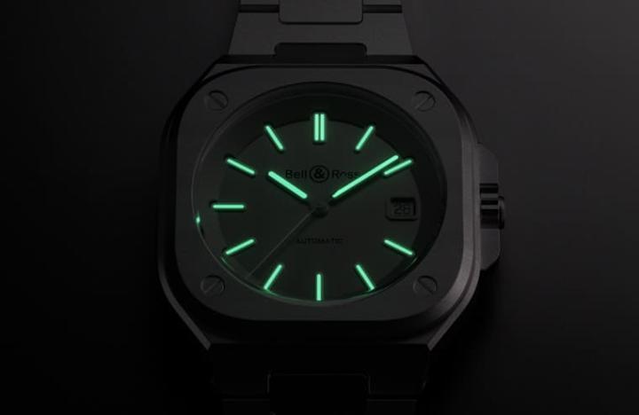 BELL & ROSS柏莱士的Horolum系列特色在于夜光,而Horolum这个名称则是源自”Horo”(制表技术)和“Lum”(光线)的组合,手表将Super-LumiNova® C5绿色夜光物料涂在时标与指针上,这种夜光物料标榜和夜间机场跑道亮着的绿灯颜色类似,让人看时间看得一清二楚。
