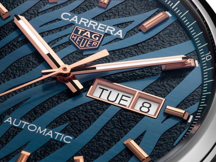 Carrera虎年限量表面盘饰点缀镀18K玫瑰金的时标、指针及日期/星期视窗外框,与12点钟位置的TAG HEUER泰格豪雅盾型标志展现色调一致性,色泽内敛的蓝色虎皮条纹与耀眼的玫瑰金色在面盘上交相辉映,既有强烈对比感又洋溢着过年时节的庆祝氛围。手表搭配的小牛皮表带延续著蓝色调色彩,两侧绣以精美金色缝线,宛如面盘细节的延伸。