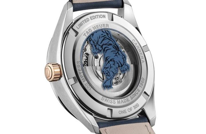 蓝宝石镜面制成的表背底盖另外印有以一只伺机而动的老虎图案,让佩戴者翻到背面时眼睛一亮,栩栩如生的老虎图案比起面盘低调的虎纹更能具体呼应农历虎年气氛。手表限量推出300只,其采用41毫米不锈钢表壳,表背镌刻”ONE OF 300”字样,强调手表数量有限的收藏意义。Carrera虎年限量表不仅丰富了泰格豪雅旗下的三针手表系列,蓝色面盘更是散发独特魅力,如同手表创作主题——老虎般富有活力与动感之美。