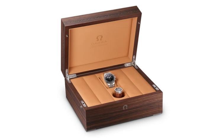 对于打算入手这款表的人,欧米茄专程制作了65周年纪念木质表盒,它的造型源自初代超霸手表的表盒,材质则是选用高级木材鹅掌楸(外观类似花梨木),光是表壳的质感就能让人先一步感受到手表的独特纪念意义。