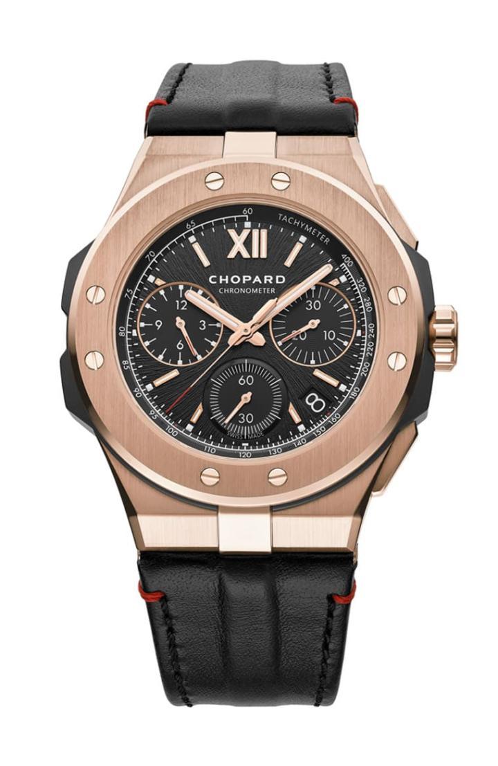 Alpine Eagle XL Chrono采用符合伦理道德标准的18K玫瑰金和陶瓷钛金属制成,这种材质组合是系列前所未见的新尝试,萧邦使用符合伦理道德标准的18K金制表不算是新鲜事,但是陶瓷钛金属对于品牌而言倒是满特别的,萧邦透过离子技术氧化钛金属表层而形成,这种处理方法使金属的硬度高达1000维氏,抗震度和耐刮特性可与陶瓷媲美。