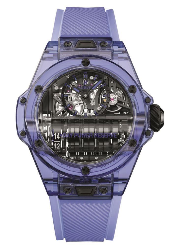 HUBLOT宇舶表从2016年推出首只Big Bang Unico透明蓝宝石计时码表以后,至今已经延伸出相当可观的蓝宝石材质表款宇宙,品牌截至2022年为止,已经研发出红、橙、黄、绿、蓝、粉红等彩色透明手表,甚至还有彩色宝石搭配透明蓝宝石的异材质融合表款。