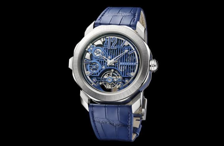 为提升声音的传播效果,宝格丽采用业界公认传声效果最佳的钛金属制作表壳,同时面盘另外加入钛金属网格,此举有助于强化报时乐音的共鸣与传播。为了呼应面盘镀成蓝色的金属网格与部分机芯零件,因此品牌也精心选择蓝色鳄鱼皮表带,展现高复杂手表华丽又尊荣的质感。