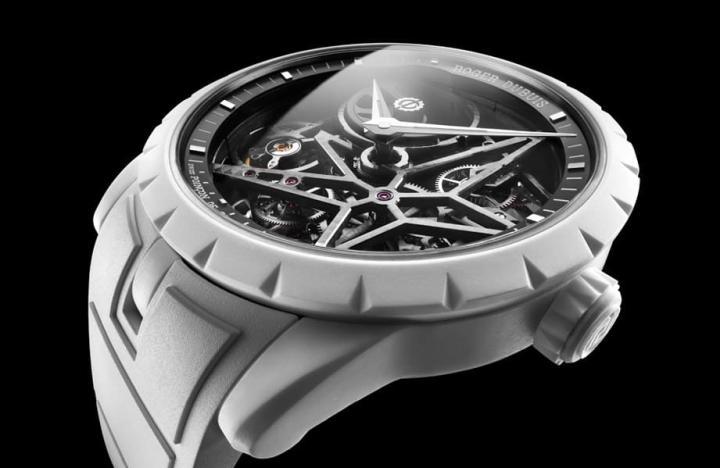 Excalibur Monobalancier的表壳、表圈和表冠等零件都是以MCF材质打造,这种材质的成分概要而言是以99.95%的二氧化硅以及片状模塑(Sheet Molding Compound)工艺制成,除了外观拥有类似陶瓷的纯白色泽,它的特性更是令人感到惊艳,例如MCF材质比陶瓷轻2.5倍、、比SMC碳纤维轻13%等,同时它的强度也高,适合用来作为表壳保护机芯。不过要注意的是MCF材质本身并非白色,而是来自罗杰杜彼替它额外添加颜料上色的结果,此材质具有抵抗紫外线、人造光与自然光的高稳定性,因此品牌大胆使用白色来彰显其优异特性。