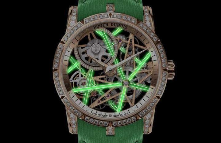 搭载RD820SQ自动机芯的Excalibur新作不只Excalibur Monobalancier,罗杰杜彼同步发表的Excalibur Blacklight在相同的机芯基础上改采玫瑰金表壳,且结合品牌同样擅长的钻石镶嵌工艺,而从表名也可以意会到手表机芯的镂空桥板乃是结合具夜光效果与紫外光感绿色微型蓝宝石的特别设计版本,相较于Excalibur Monobalancier的纯白素雅,Excalibur Blacklight镂空自动表则是极尽抢眼之能事,手表搭配的绿色牛皮表带与贵金属表壳和钻石光芒互相辉映,表款限量数28只比起限量88只的Excalibur Monobalancier珍贵性有过之而无不及。