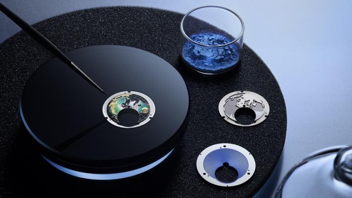 “内填”,顾名思义,即为“填充”的意思,是一种高雅的古老珐瑯工艺,约于2,500年前首次被人采用。工匠必须施展高超技艺,首先从金属原料中雕刻出凹槽,并精准地勾勒出目标图案的轮廓,而在此表盘中则是从北极上空观察到的陆地形状。然后,在凹陷处填入多层珐瑯,每一层均需经高温焙烧,直至与原本的表面一样平整。之后,于制作完成的珐瑯表面上,以微绘细节呈现各大洲的主要景观特色,令设计更显精妙别致。