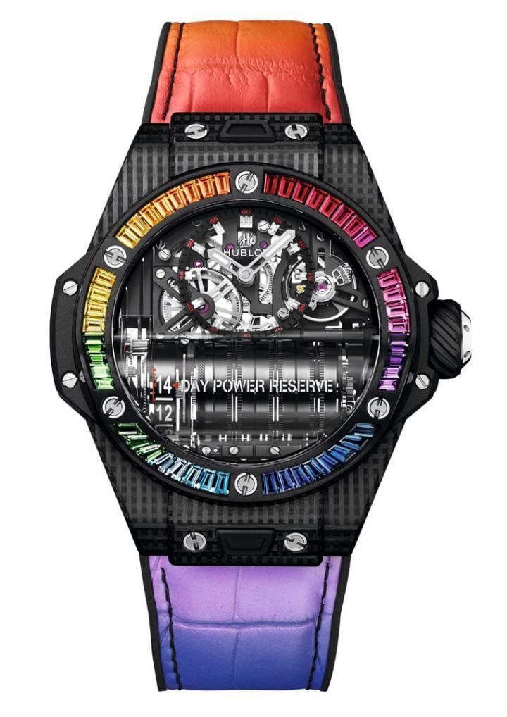 HUBLOT宇舶的Big Bang MP-11超长动能手表2022年采用高科技材质表壳,搭配吸睛又讨喜的彩虹宝石圈,于手表的佩戴感以及视觉上的惊艳度等层面,双双再进化至崭新层次。