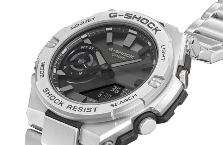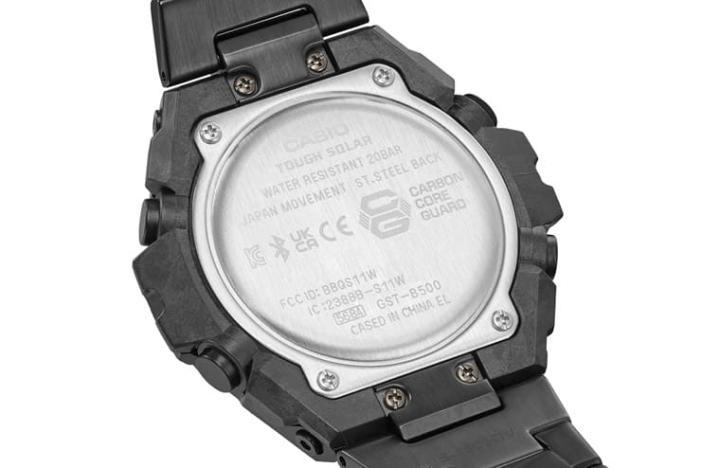 G-SHOCK于手表制作过程中导入Carbon Core Guard碳纤维核心防护构造,兼具强度与轻盈的优点,造就手表厚度仅12.8mm,以及143g的整体重量,光看数字可能不容易体会,举例来说,同样属于G-STEEL系列GST-B400,它的厚度为13.8mm,重量则有160g,两者比起来GST-B500系列显得更纤薄又更轻盈。手表表耳中的树脂缓冲零件可防止冲击力从表圈蔓延到表壳和表带,而不锈钢表带连结零件亦具备经过品牌测试通过的耐冲击性和结构强度。