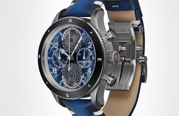 表款采用44mm的钛金属表壳,搭配带有罗盘方位的缎面抛光双向旋转陶瓷表圈,同时手表的面盘延续1858系列Iced Sea日期显示自动表的风格,采用以Gratté Boisé刮磨技法制成的蓝色冰河纹设计,看起来别具个性。手表面盘除了在12点与6点方向设有具备24小时刻度的南北半球转动地球仪,由于其搭载机芯的功能经过升级优化,因此还可见在3点与9点方向增加了30分计时盘与12小时计时盘,借由表侧两枚按把可以操控计时功能的启动、停止与归零等动作。