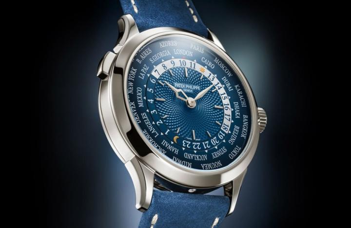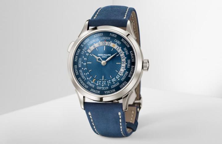 PATEK PHILIPPE百达翡丽Complications系列的世界时区手表5230原本有白金(5230G-014)和玫瑰金款式(5230R-012),两者的面盘都是白色城市环加上岩灰色编织波纹图案,不过2022年这两款很有默契地携手停产,取而代之是新作5230P-001,从型号可以看出手表改成了更尊贵的铂金材质,同时品牌也针对面盘、表带颜色进行调整,以有别于前作的印象重新出发。