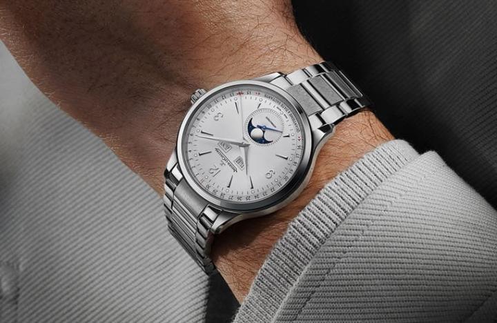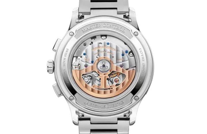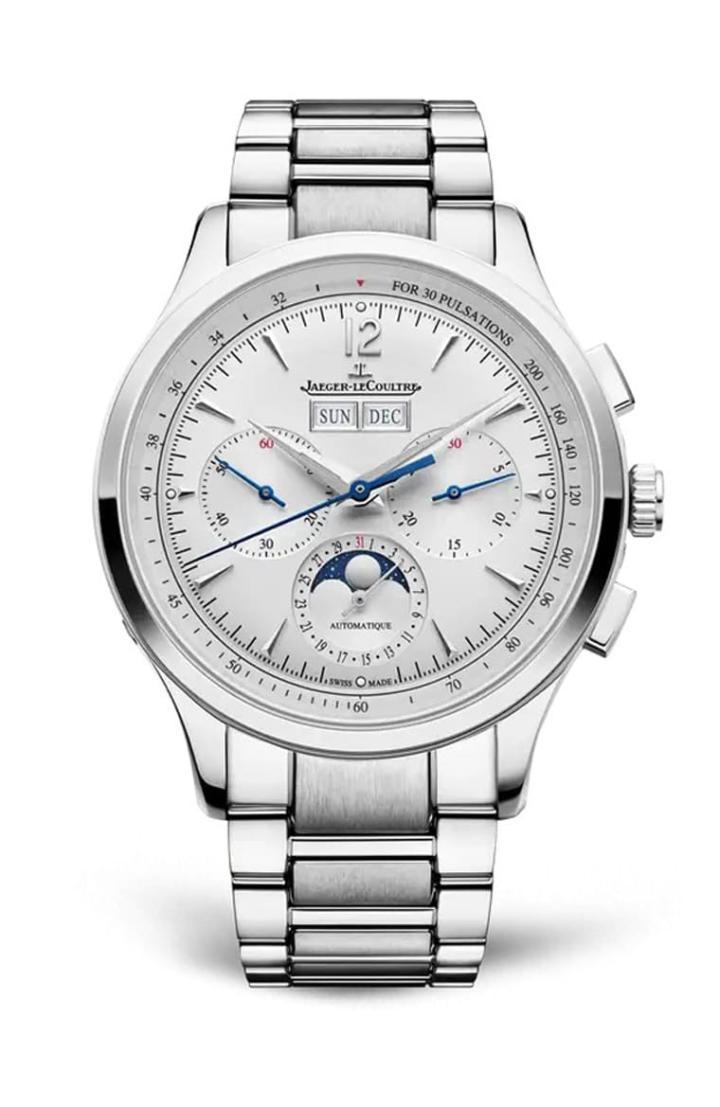 Master Control Chronograph Calendar大师系列计时日期表同样采用银色面盘,手表搭配蓝钢计时指针与蓝色月相盘,使复杂功能更清晰易读。两款Master Control系列作品都是首次采用配备表带快拆系统统的精钢炼带,这是现代新表中愈来愈不可或缺的重要元素。