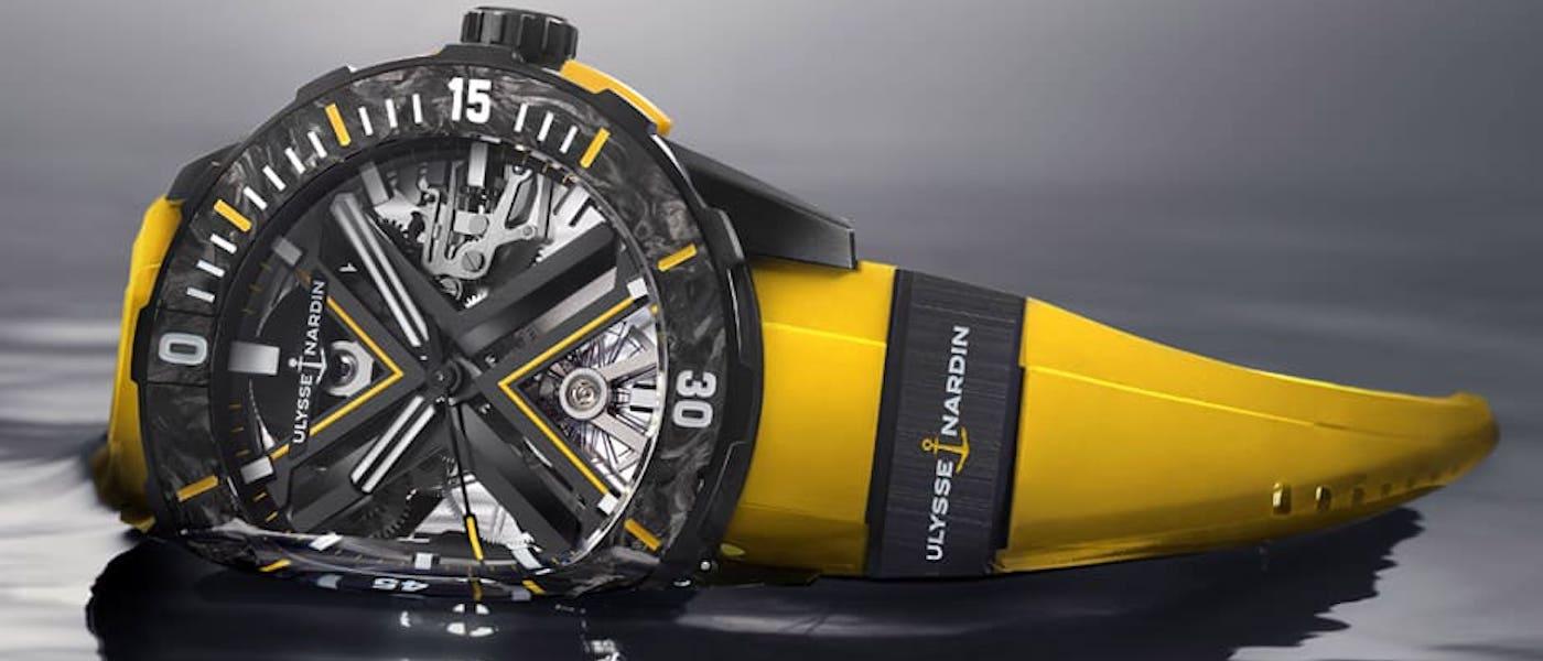 ULYSSE NARDIN雅典表的Diver X镂空潜水表2022年新出劲黑款,品牌采用黑色碳正离子材质(Carbonium®)搭配黑色DLC钛金属,同时也配置了很有话题性的表带,于视觉和工艺层面上双双展现高话题性。