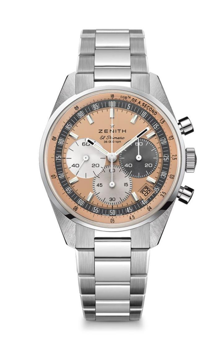 既然是联名表,肯定会有不一样的地方,Hodinkee此次出手替Chronomaster Original手表擘画了雾面鲑鱼色面盘,替手表带来充满活力和罕见的温暖底色。鲑鱼色面盘部分,Hodinkee团队精选偏橙色调而非红色的色泽,雾面蛋白处理方式使面盘色彩无需额外修饰就能闪耀光彩。在鲑鱼色基调面盘上,品牌采用白、浅灰与深灰色点缀小表盘,重新演绎释El Primero计时码表的三色计时盘设计,此外位于4:30方向的日期显视 窗,则采用与面盘相同色调烘托黑色日期字样。